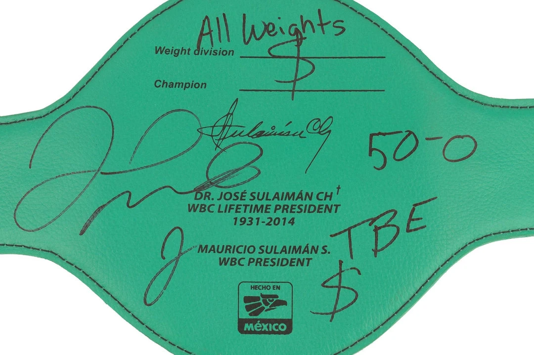 During the World Boxing Council’s annual convention no. 59 Floyd Mayweather and “The Money Team” signed this iconic piece representing the Green Belt of Champions Replica.